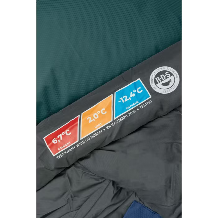 Dzięki zastosowaniu wysokiej jakości naturalnego wypełnienia, śpiwór oferuje doskonałe właściwości izolacyjne. 300 g puchu kaczego o sprężystości 750 cuin zapewnia komfort snu w temperaturach do 6,7°C, z limitem wynoszącym 2°C i ekstremalną temperaturą do -12,4°C. Wypełnienie charakteryzuje się znakomitym stosunkiem puchu do pierza 90/10 oraz posiada certyfikat RDS, potwierdzający humanitarne pozyskiwanie materiału.